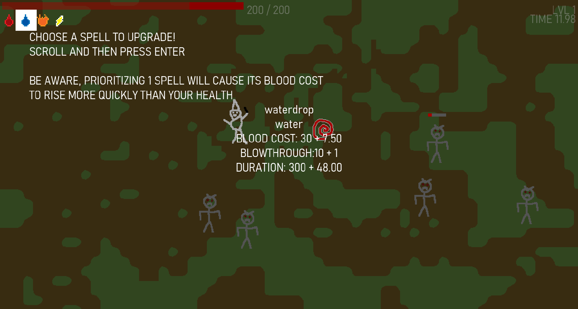 Killing enough enemies will cause you to level up, upgrading your health and all spells and giving you the option to further upgrade a spell of your choice. Be careful! if you focus upgrading just one spell you may find its cost in blood rises higher than your health and will make it impossible to use. Spread out your focus and use the synergies of the spells to deal damage while using the blood spell to top your health back up!